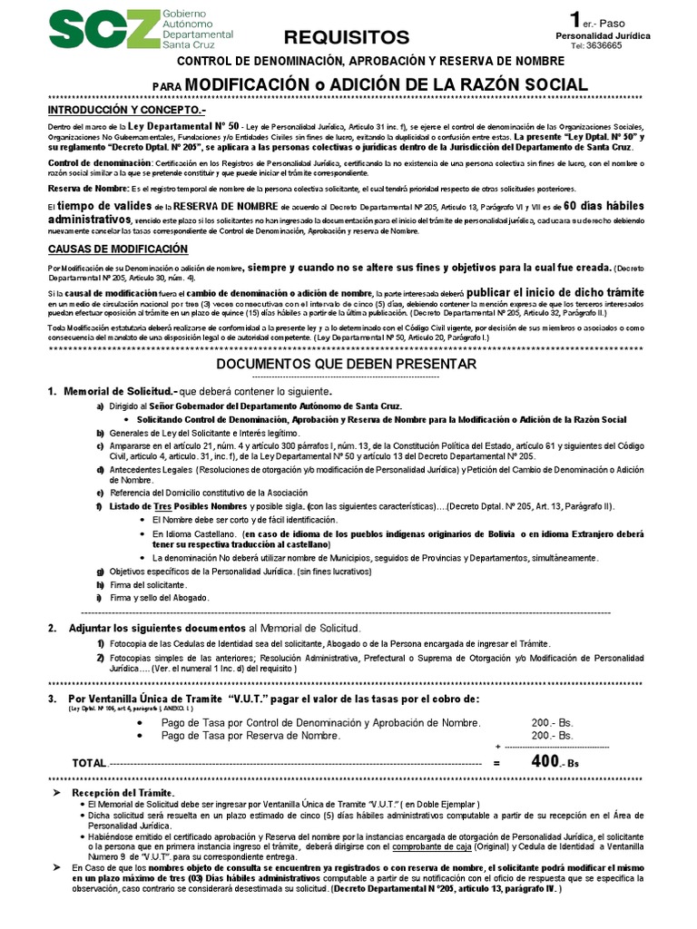 b) Copia de Cedula de Identidad. (Solicitante o persona encargada de ingresar el tramite ) 4) por modificación de su denominación o adición de nombre, siempre y cuando Ley Departamental Nº 50 - Ley de Personalidad Jurídica - (19 de Octubre de