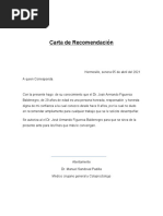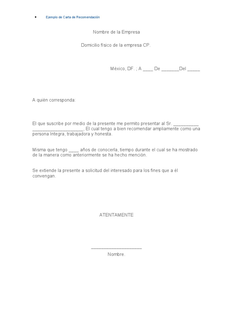 El que suscribe por medio de la presente me permito presentar al Sr. __________ ____________________, El cual tengo a bien recomendar ampliamente como una persona Integra, trabajadora y honesta. Misma que tengo ____ aos de conocerla, tiempo durante el cual se ha mostrado de la manera como anteriormente se ha hecho mencin. Se extiende la presente a solicitud del interesado para los fines que a l convengan.