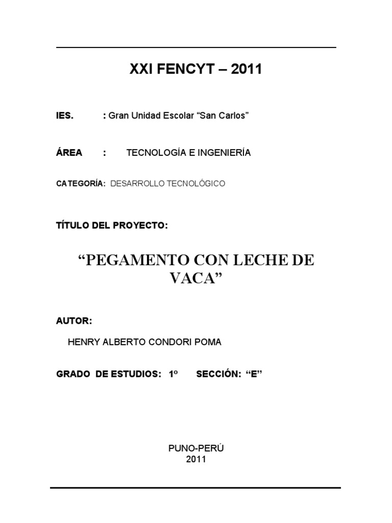 En la actualidad, adems de los numerosos pegamentos producidos a partir de polmeros sintticos, se utilizan adhesivos basados en productos naturales, que para ciertas aplicaciones, pueden competir con xito con los adhesivos sintticos modernos. Entre ellos encontramos los engrudos, obtenidos como resultado de la mezcla de harina (almidn) y agua. Nuestro proyecto se trata del aprovechamiento de la casena de la leche de vaca en la elaboracin de una cola de fuerte poder adhesivo, muy usada, por ejemplo, en el enchapado de maderas y la construccin de muebles. OBJETIVOS Aprovechar y procesar la elaboracin de pegamentos de leche. Utilizar el pegamento de leche en el pegado de papeles, cartones, maderas, etc. 2. MARCO TERICO ANTECEDENTES