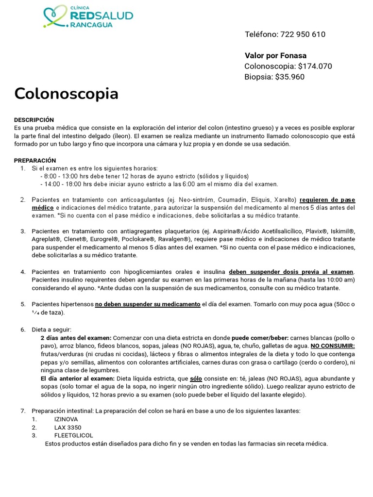 2 días antes del examen: Comenzar con una dieta estricta en donde puede comer/beber: carnes blancas (pollo o