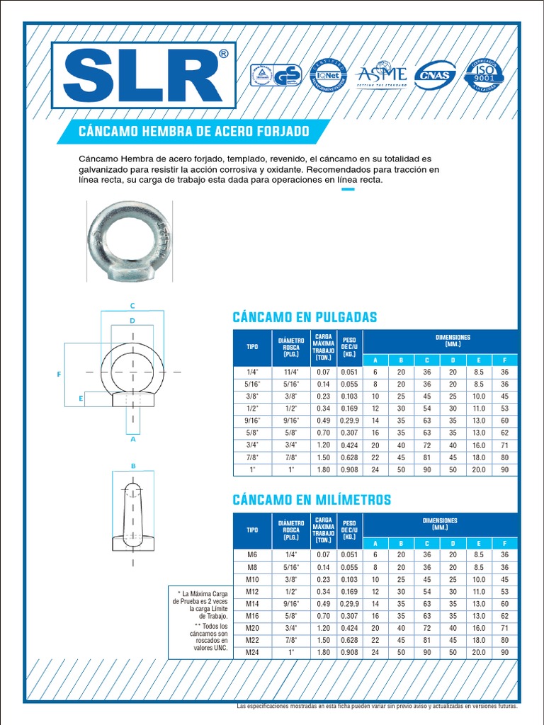 Cáncamo Hembra de acero forjado, templado, revenido, el cáncamo en su totalidad es