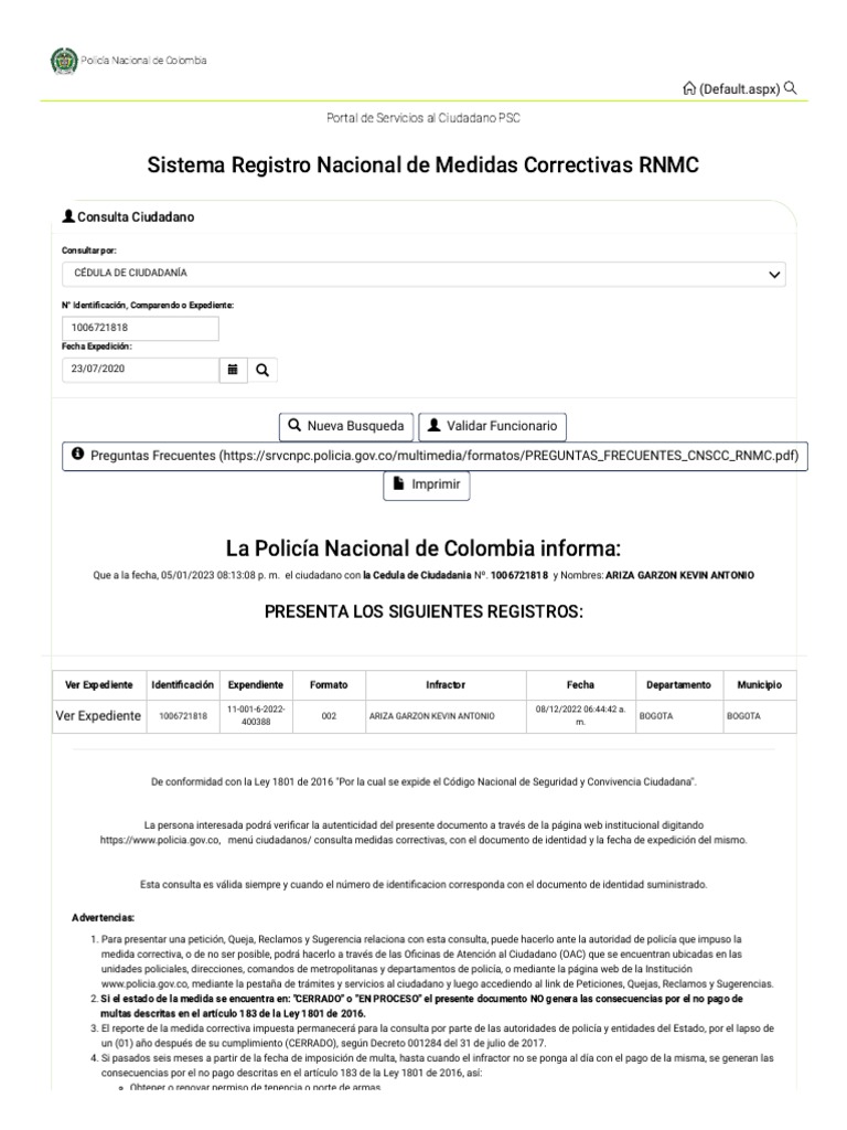 Que a la fecha, 05/01/2023 [Link] p. m. el ciudadano con la Cedula de Ciudadania Nº. 1006721818 y Nombres: ARIZA GARZON KEVIN ANTONIO