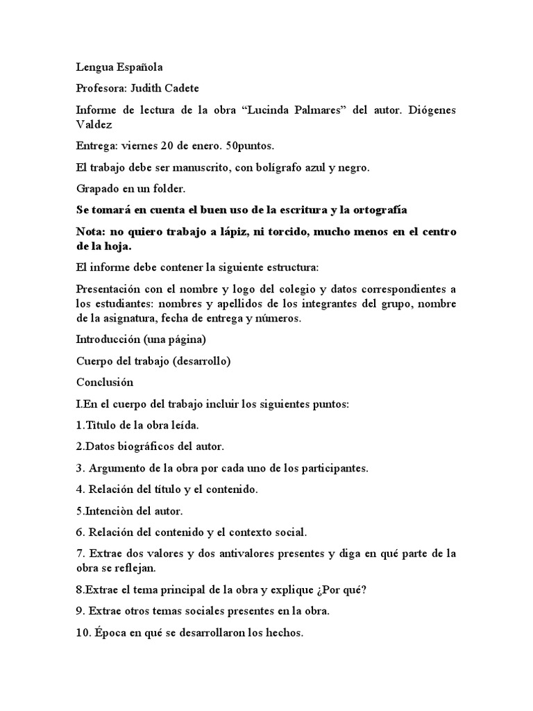 Informe de lectura de la obra “Lucinda Palmares” del autor. Diógenes