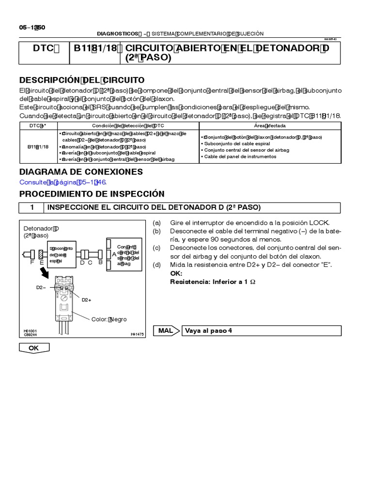 Cuando se detecta un circuito abierto en el circuito del detonador D (2ª paso), se registra el DTC B1181/18.
