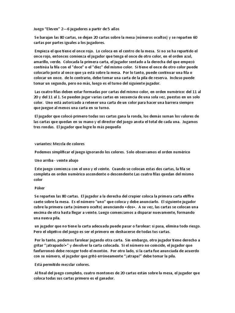 20 y del 11 al 1. Se pueden jugar varias cartas en secuencia de una sola vez, puestas en un solo