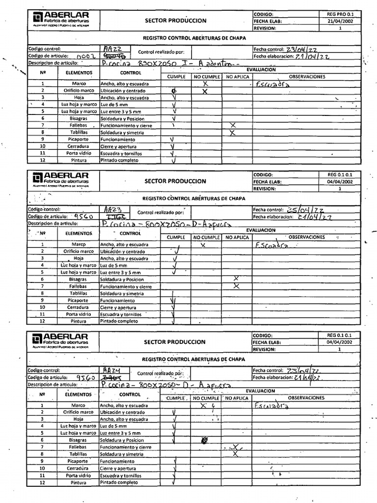 REGISTRO CONTROL ABERTURAS DE CHAPA