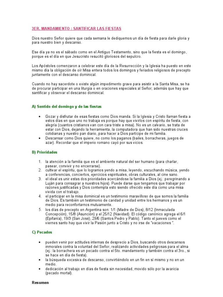 B) Prioridades 1. la atencin a la familia que es el ambiente natural del ser humano (para charlar, pasear, convivir y no encerrarse). 2. cultivar el espritu, que lo logramos yendo a misa, leyendo, escuchando msica, yendo a conferencias, conciertos, ejercicios espirituales, obras culturales, al cine sano. 3. el ideal es unir estas dos prioridades acercndose la familia a Dios (ej.: peregrinando a Lujn para consagrar a nuestros hijos). Puede darse que tengamos que trabajar por razones justificadas y Dios contempla esto siendo ofrecido este da como una misa vivida con el trabajo. 4. el participar en la misa dominical es un testimonio maravilloso de que somos la familia de Dios. Es tambin un testimonio de caridad y unidad entre los hermanos y es un medio para reconfortarnos mutuamente. 5. los das de precepto en Argentina son: 1/1 (Madre de Dios), 8/12 (Inmaculada Concepcin), 15/8 (Asuncin) y el 25/12 (Navidad). El cdigo cannico agrega el 6/1 (Epifana), 19/3 (San Jos), 29/6 (Santos Pedro y Pablo). Tanto el jueves como el viernes santo hay que vivir la Pasin junto a Cristo y no irse de "vacaciones ". C) Pecados pueden venir por actitudes internas de desprecio a Dios, buscando otros descansos inmorales contra la voluntad del Seor, realizando actividades peligrosas para el alma (ej.: la borrachera es un pecado contra el 5to. mandamiento y tambin contra el 3ro., si se hace en da de fiesta). la bsqueda excesiva de descanso, convirtindolo en un fin en s mismo y no en un medio. dedicacin al trabajo en das de fiesta sin necesidad, movido slo por la avaricia (pecado mortal).