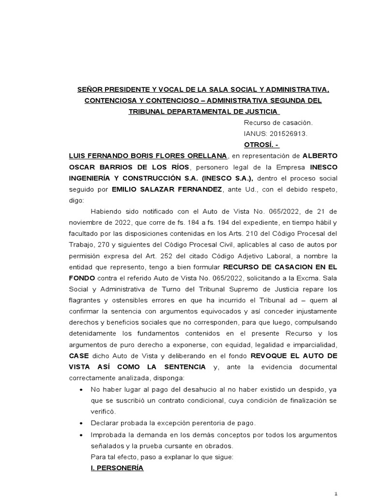 INGENIERÍA Y CONSTRUCCIÓN S.A. (INESCO S.A.), dentro el proceso social