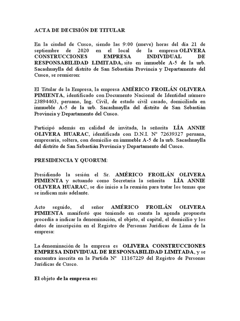El Titular de la Empresa, la empresa AMÉRICO FROILÁN OLIVERA