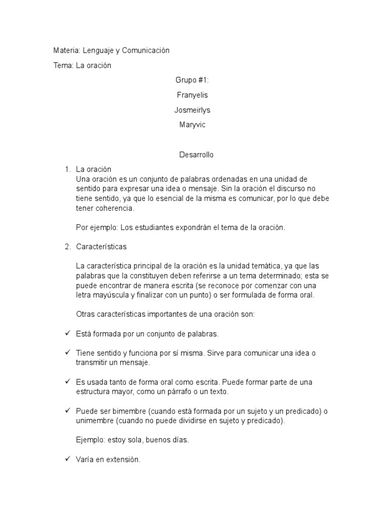Otras características importantes de una oración son: