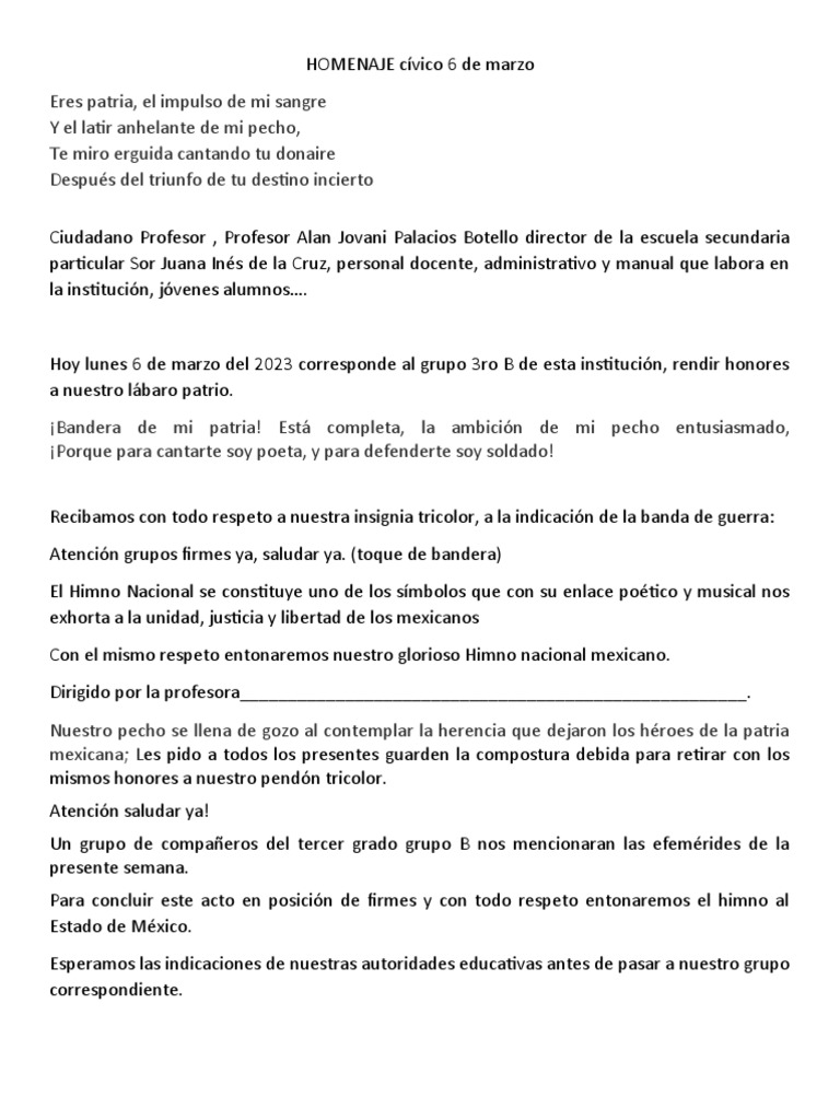 Hoy lunes 6 de marzo del 2023 corresponde al grupo 3ro B de esta institución, rendir honores
