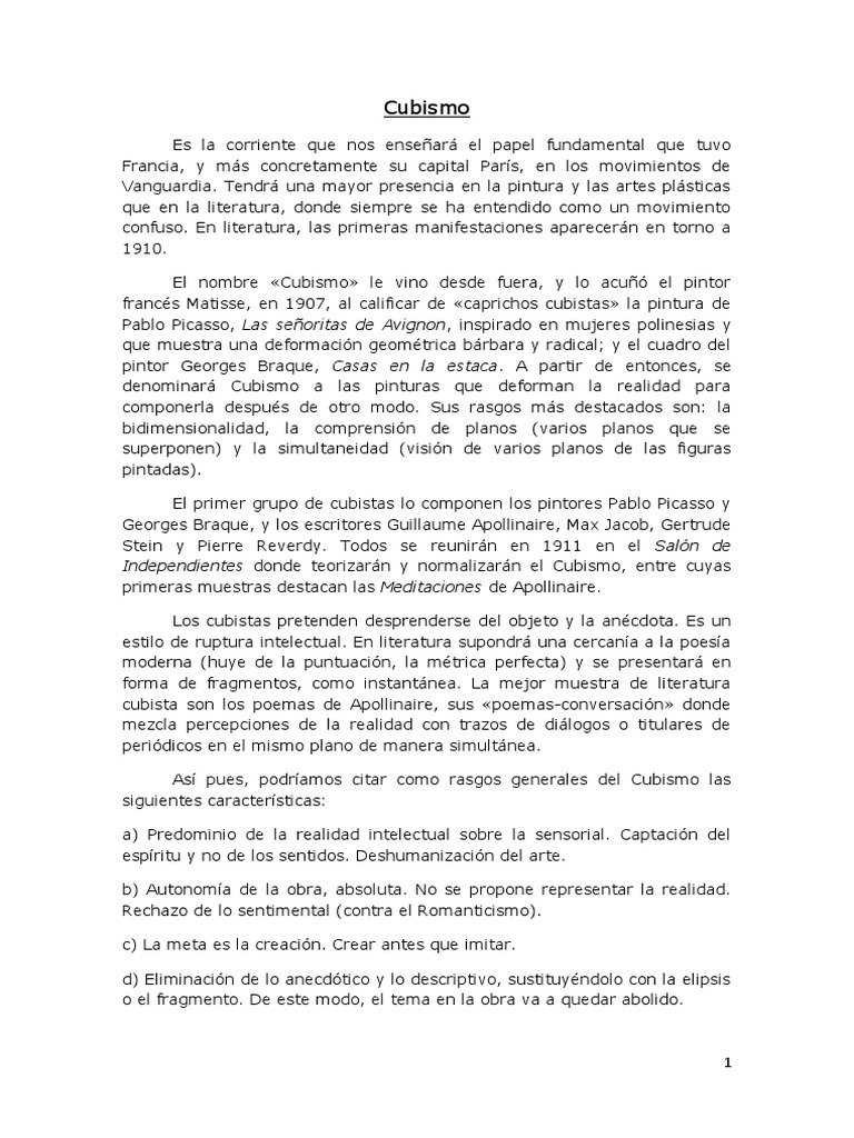 Así pues, podríamos citar como rasgos generales del Cubismo las