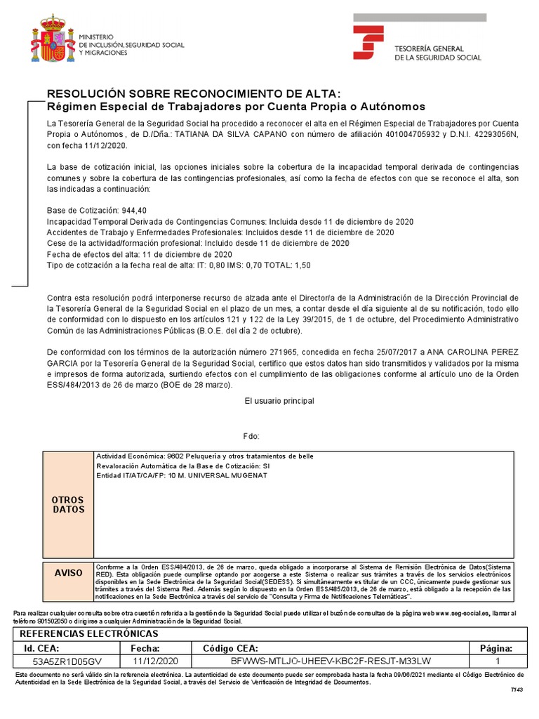 Propia o Autónomos , de D./Dña.: TATIANA DA SILVA CAPANO con número de afiliación 401004705932 y D.N.I. 42293056N,