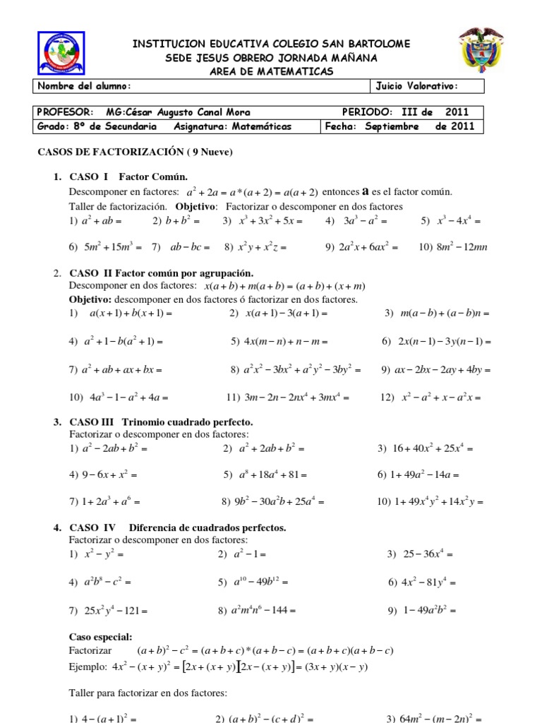CASOS DE FACTORIZACIN ( 9 Nueve) 1. CASO I Factor Comn. Descomponer en factores: a 2 2a a * (a 2) a(a 2) entonces a es el factor comn. Taller de factorizacin. Objetivo: Factorizar o descomponer en dos factores 1) a 2 ab 2) b b2 3) x3 3x 2 5x 4) 3a3 a 2 5) x3 4x 4 6) 5m2 15m3 7) ab bc 8) x 2 y x 2 z 9) 2a 2 x 6ax 2 10) 8m2 12mn