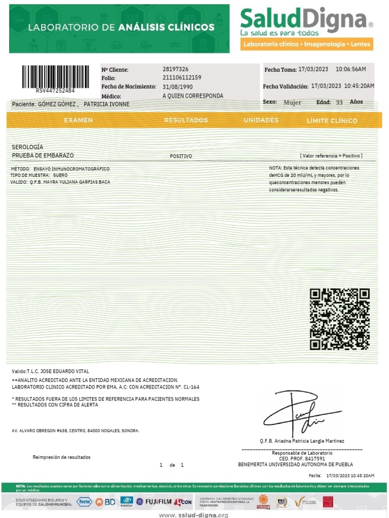 PRUEBA DE EMBARAZO POSITIVO [ Valor referencia = Positivo ]