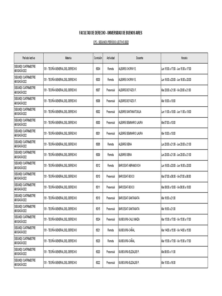 131 - TEORÍA GENERAL DEL DERECHO 6004 Remota ALEGRE-CHORNY E. Lun 15:30 a 17:00 - Jue 15:30 a 17:00