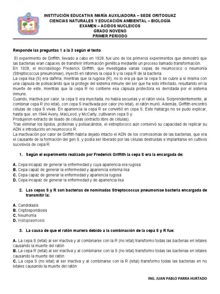 1. Según el experimento realizado por Frederick Griffith la cepa S era la encargada de: