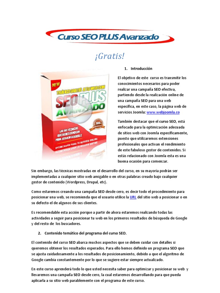 1. Introduccin El objetivo de este curso es transmitir los conocimientos necesarios para poder realizar una campaa SEO efectiva, partiendo desde la realizacin online de una campaa SEO para una web especfica, en este caso, la pgina web de servicios Joomla: www.webjoomla.co Tambin destacar que el curso SEO, est enfocado para la optimizacin adecuada de sitios web con Joomla especficamente, puesto que utilizaremos extensiones profesionales que activan el rendimiento de este fabuloso gestor de contenidos. Si ests relacionado con Joomla esta es una buena ocasin para comenzar. Sin embargo, las tcnicas mostradas en el desarrollo del curso, en su mayora podrn ser implementadas a cualquier sitio web amigable o en otras palabras creado bajo cualquier gestor de contenido (Wordpress, Drupal, etc). Como estaremos creando una campaa SEO desde cero, es decir todo el procedimiento para posicionar una web, se recomienda que el usuario utilice la URL del sitio web a posicionar o en su defecto el de algunos de sus clientes. Es recomendable esta accin porque a partir de ahora estaremos realizando todas las actividades a seguir para posicionar tu web en los primeros resultados de bsqueda de Google y del resto de los buscadores. 2. Contenido temtico del programa del curso SEO. El contenido del curso SEO abarca muchos aspectos que se deben cuidar con detalles si queremos obtener los resultados esperados. Para ello hemos definido un programa SEO que se ajusta cuidadosamente a los resultados de posicionamiento, debido a que el algoritmo de Google cambia constantemente por lo que se sugiere estar siempre actualizado. En este curso aprender todo lo que usted necesita saber para optimizar y posicionar su web y llevaremos una campaa SEO desde cero, la cual estaremos desarrollando para que pueda aplicarla a su sitio web parablemente con el programa de este curso.