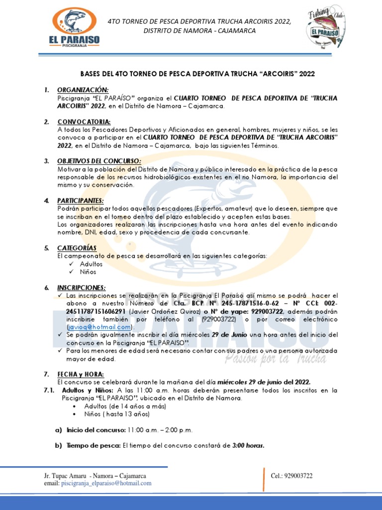 BASES DEL 4TO TORNEO DE PESCA DEPORTIVA TRUCHA “ARCOIRIS” 2022