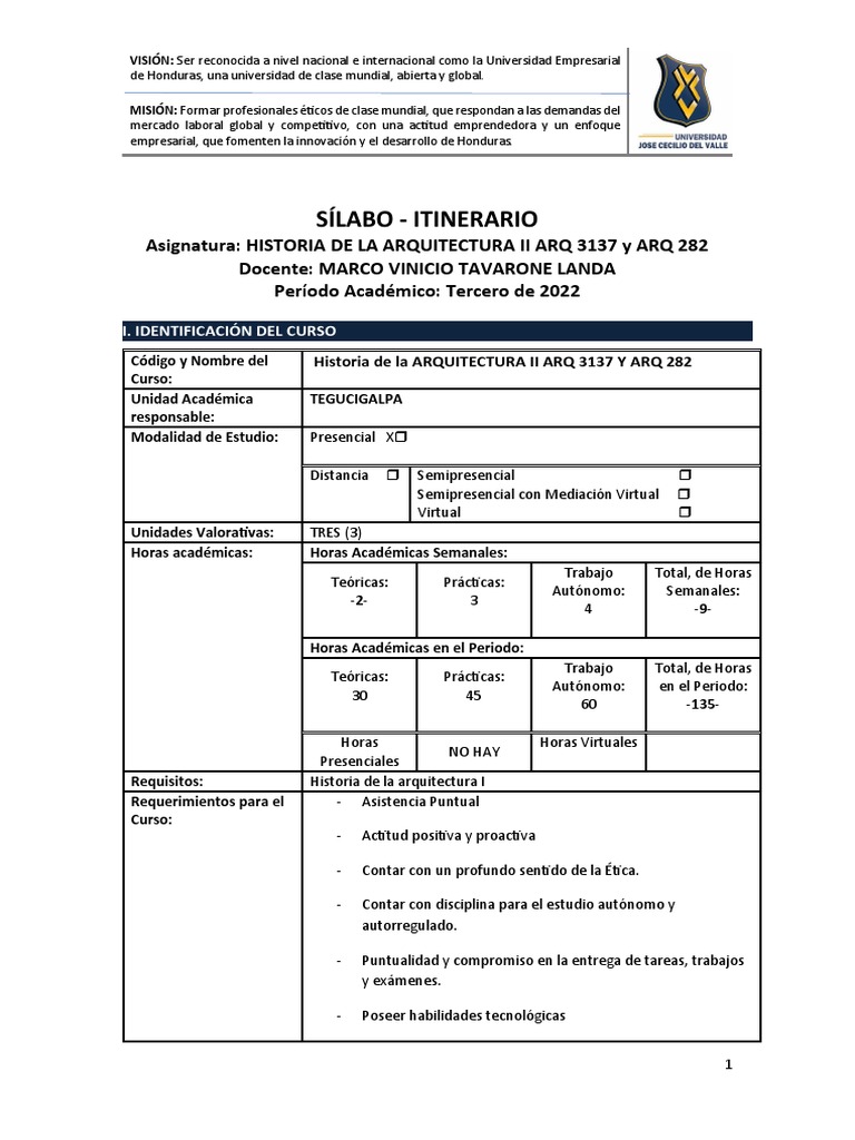 Código y Nombre del Historia de la ARQUITECTURA II ARQ 3137 Y ARQ 282
