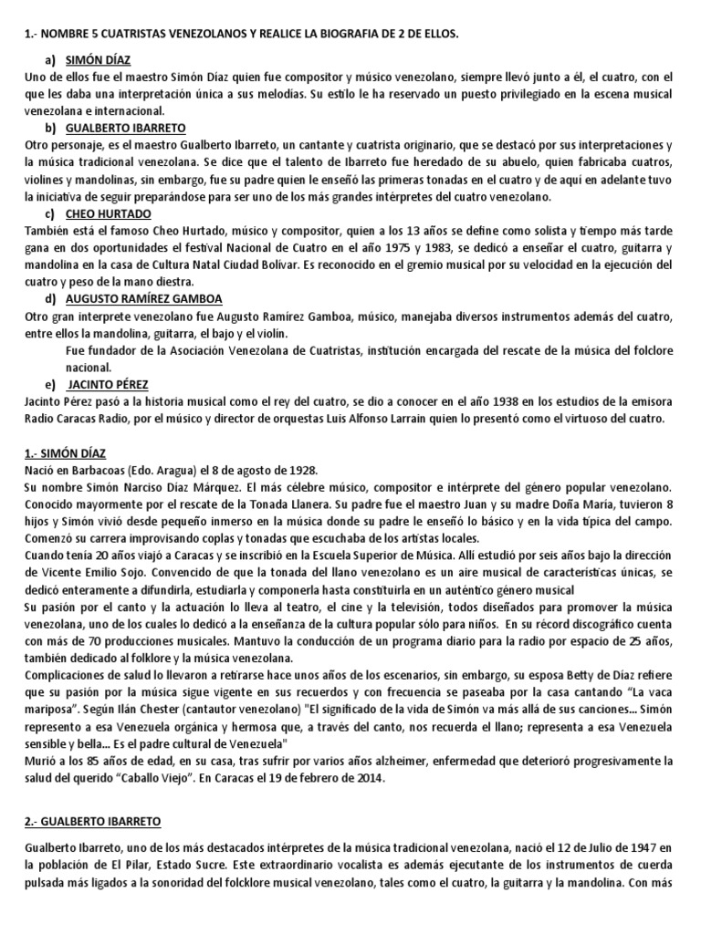 1.- NOMBRE 5 CUATRISTAS VENEZOLANOS Y REALICE LA BIOGRAFIA DE 2 DE ELLOS.