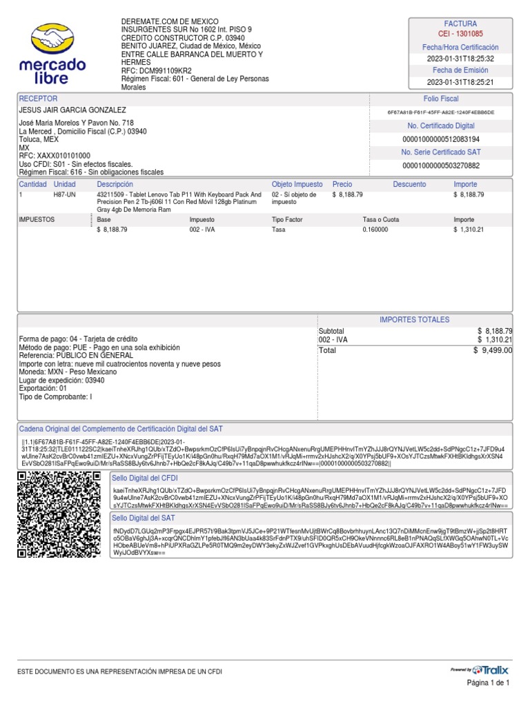 Forma de pago: 04 - Tarjeta de crédito 002 - IVA $ 1,310.21