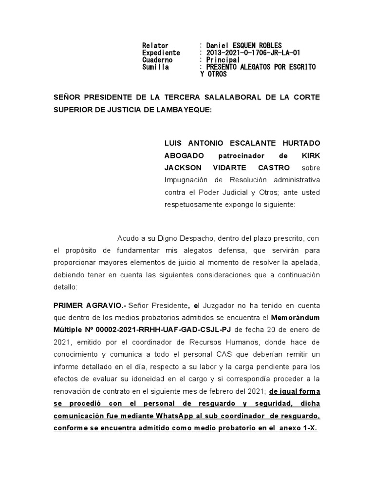 Sumilla : PRESENTO ALEGATOS POR ESCRITO
