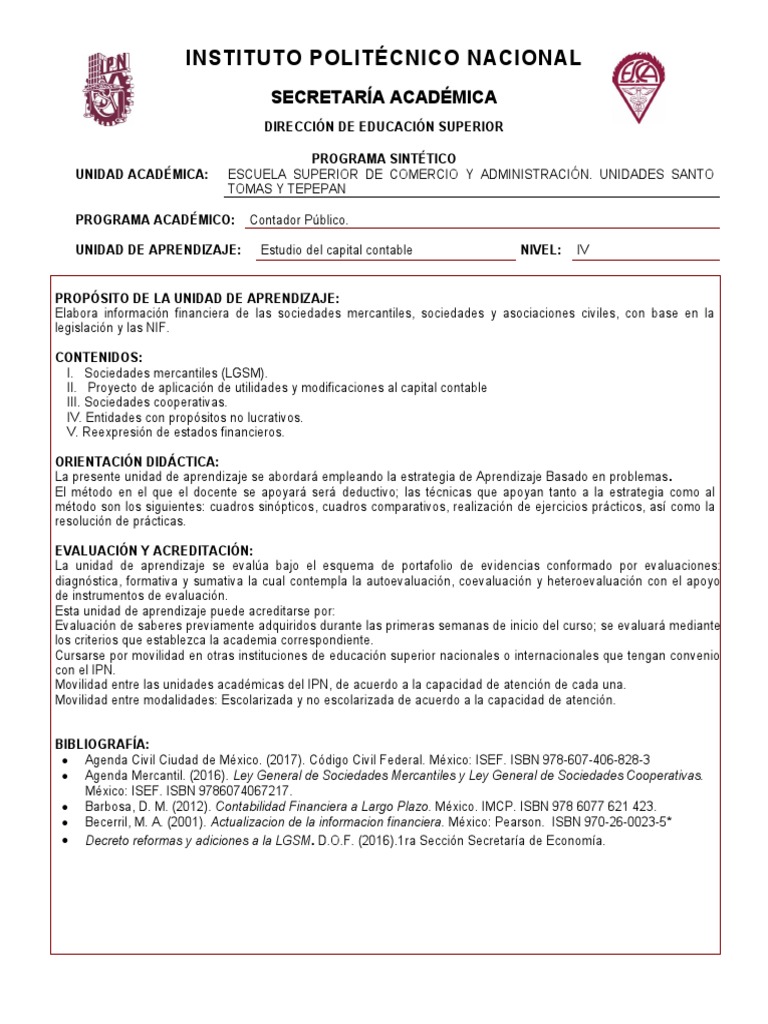 UNIDAD ACADÉMICA: ESCUELA SUPERIOR DE UNIDAD DE APRENDIZAJE: Estudio del capital