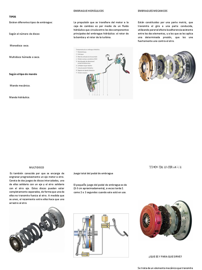 Existen diferentes tipos de embrague: La propulsión que se transfiere del motor a la Están constituidos por una parte motriz, que