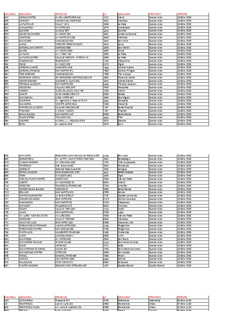 SUCURSAL LOCALIDAD DOMICILIO CP LOCALIDAD PROVINCIA HORARIO