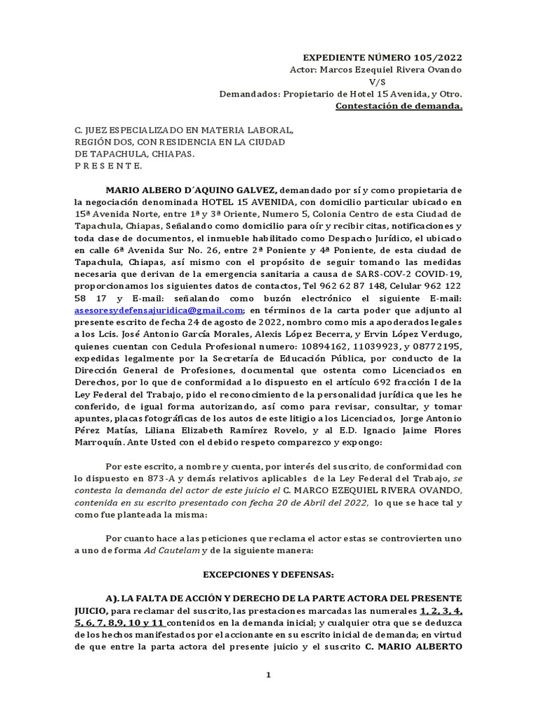 contesta la demanda del actor de este juicio el C. MARCO EZEQUIEL RIVERA OVANDO,