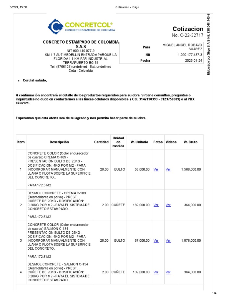 De acuerdo con nuestra conversación adjuntamos cotización para 1.150 M2 de materiales para Concreto Estampado