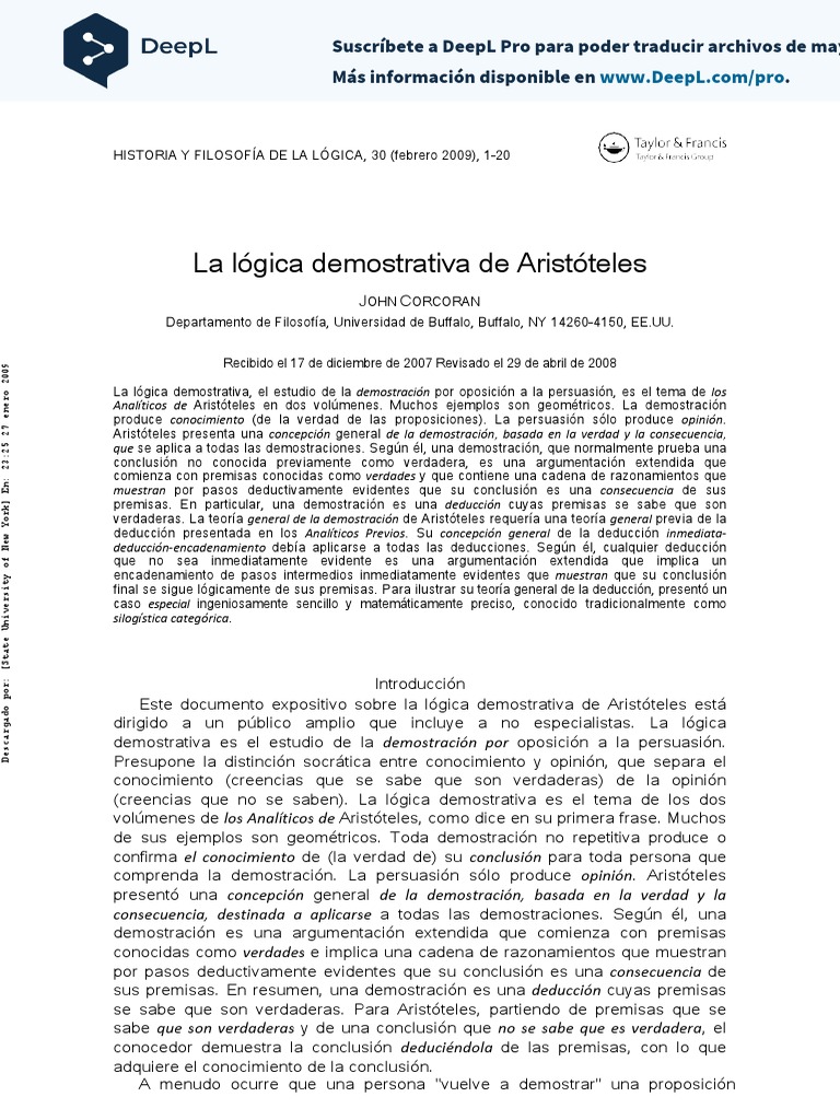 Este documento expositivo sobre la lógica demostrativa de Aristóteles está