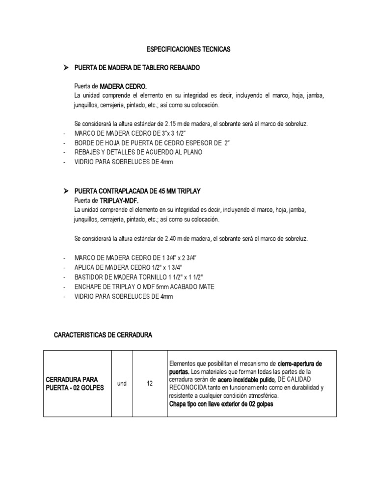 A continuación, se muestra un cuadro de las cantidades y características complementarias de las puertas: