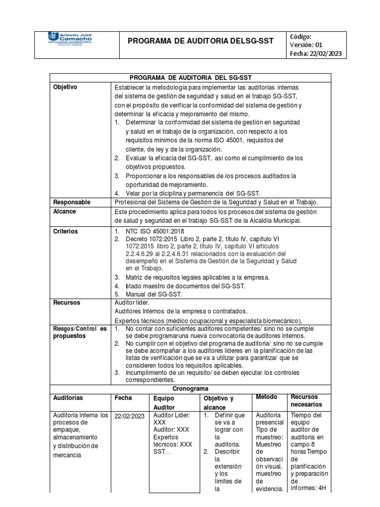 PROGRAMA DE AUDITORIA DEL SG-SST Versión: 01