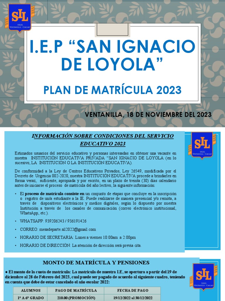 ● El monto de la cuota de matrícula: La matricula de nuestra I.E, se apertura a partir del 19 de