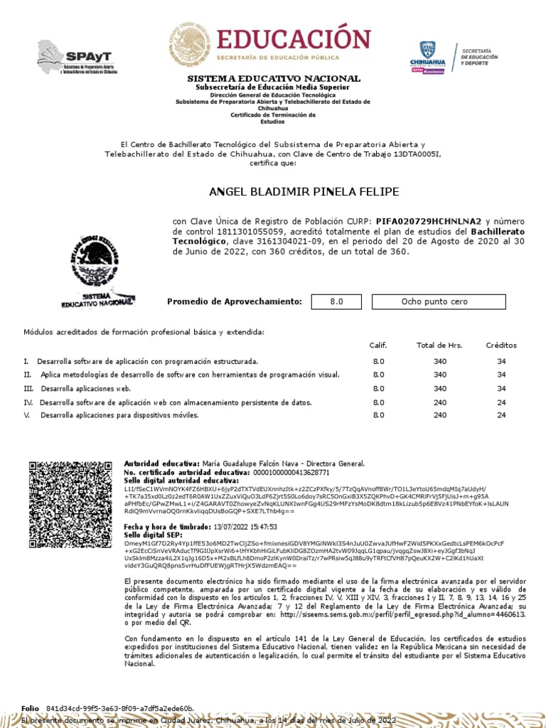 Promedio de Aprovechamiento: 8.0 Ocho punto cero