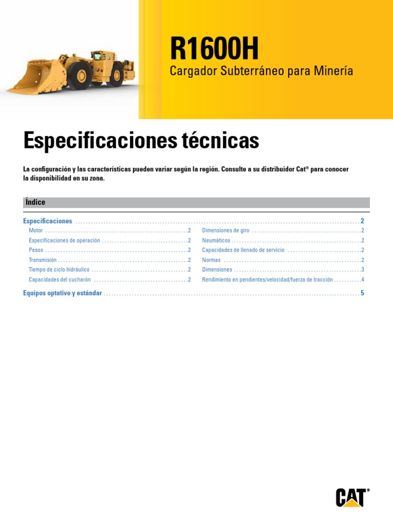 Especificaciones del Cargador Subterráneo para Minería R1600H