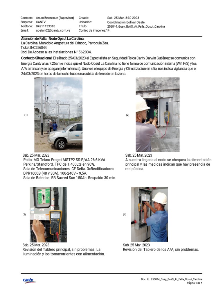 Contexto Situacional: El sábado 25/03/2023 el Especialista en Seguridad Física Cantv Darwin Gutiérrez se comunica con