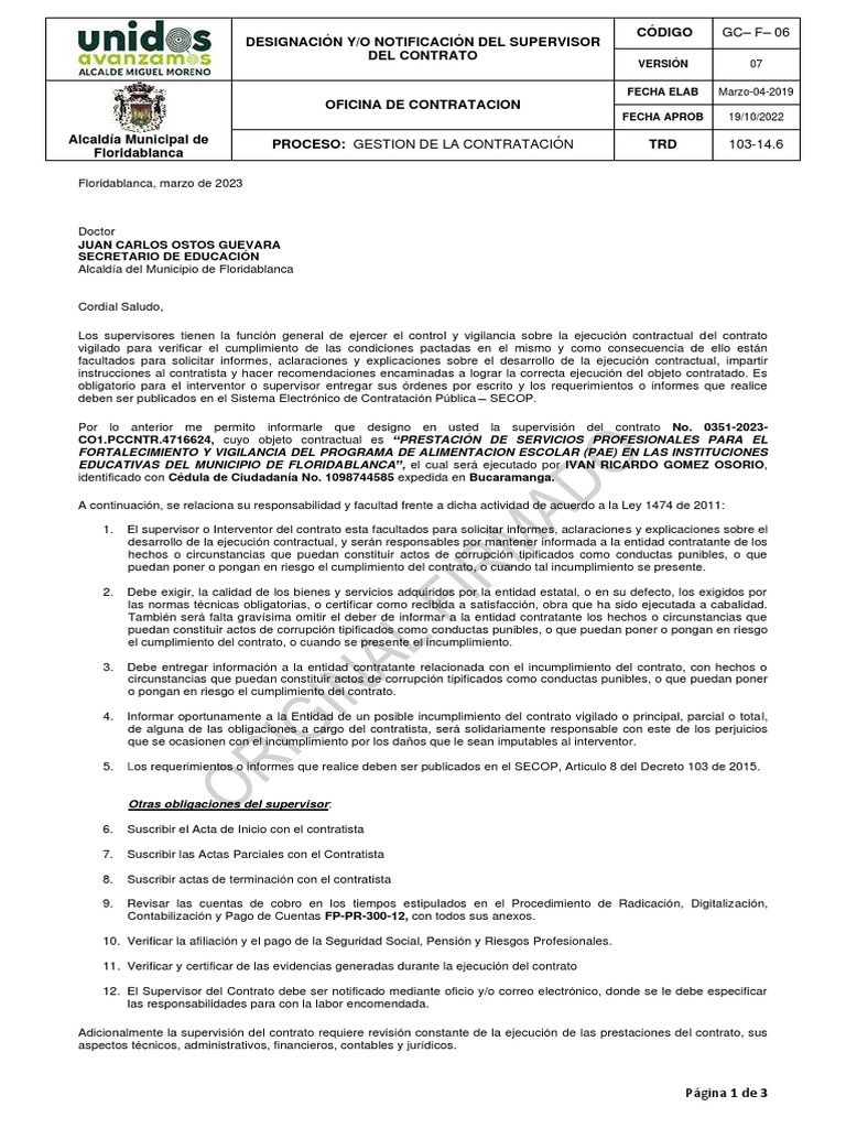 notificación, aprobando el mismo y aceptando su designación de supervisión del contrato.