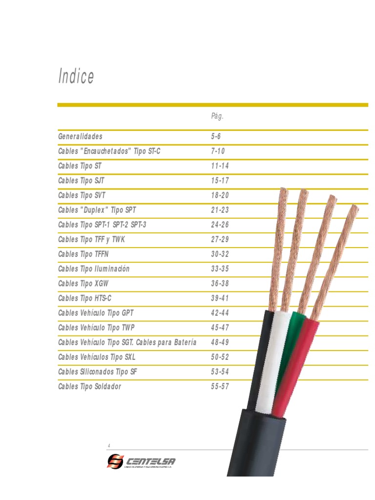 Generalidades Cables "Encauchetados" Tipo ST-C Cables Tipo ST Cables Tipo SJT Cables Tipo SVT Cables "Duplex" Tipo SPT Cables Tipo SPT-1 SPT-2 SPT-3 Cables Tipo TFF y TWK Cables Tipo TFFN Cables Tipo Iluminacin Cables Tipo XGW Cables Tipo HTS-C Cables Vehculo Tipo GPT Cables Vehculo Tipo TWP Cables Vehculo Tipo SGT. Cables para Batera Cables Vehculos Tipo SXL Cables Siliconados Tipo SF Cables Tipo Soldador