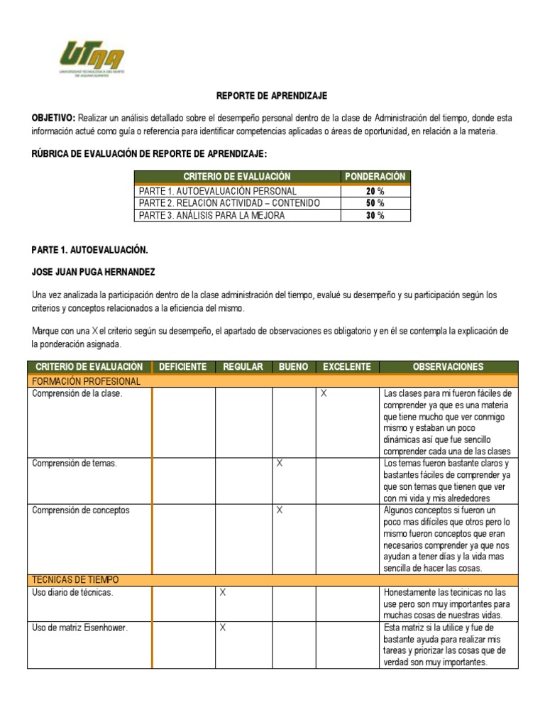 OBJETIVO: Realizar un análisis detallado sobre el desempeño personal dentro de la clase de Administración del tiempo, donde esta