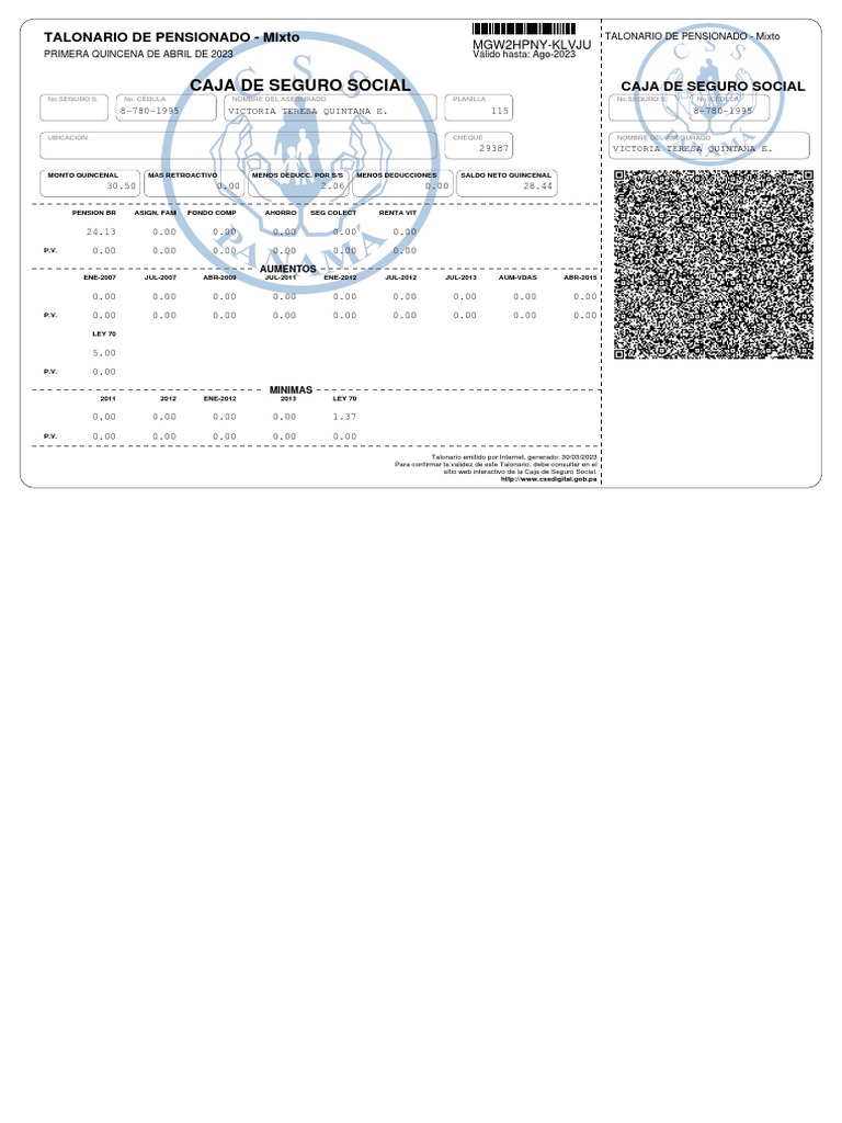 PRIMERA QUINCENA DE ABRIL DE 2023 Válido hasta: Ago-2023