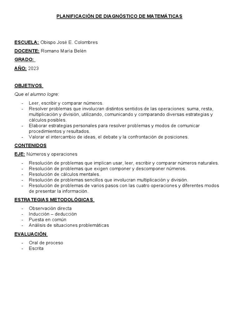 PLANIFICACIÓN DE DIAGNÓSTICO DE MATEMÁTICAS