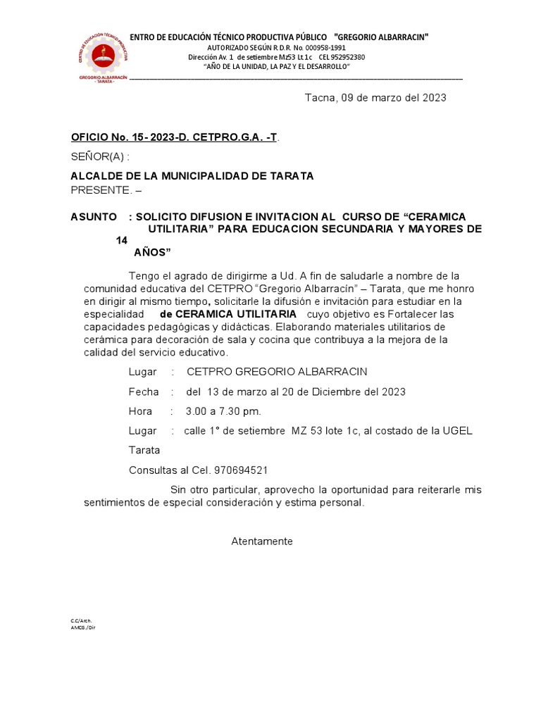 OFICIO No. 15- 2023-D. CETPRO.G.A. -T.