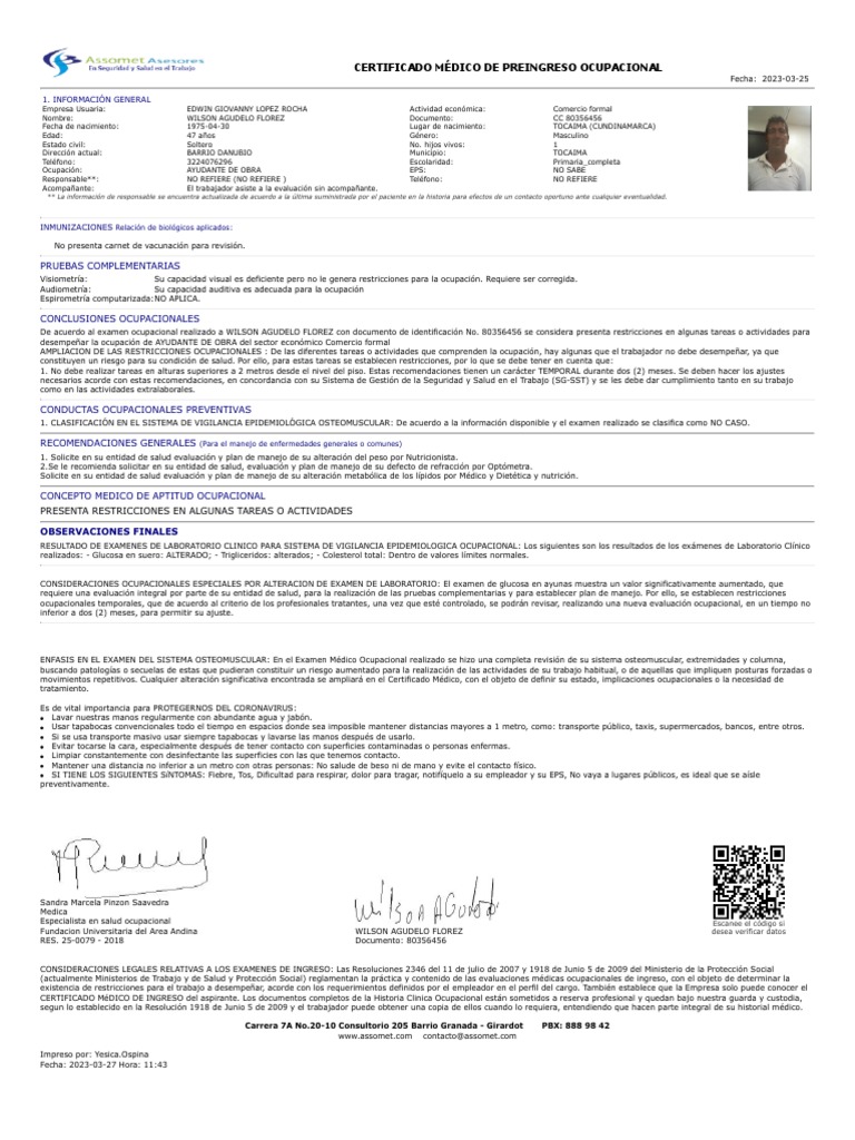 De acuerdo al examen ocupacional realizado a WILSON AGUDELO FLOREZ con documento de identificación No. 80356456 se considera presenta restricciones en algunas tareas o actividades para