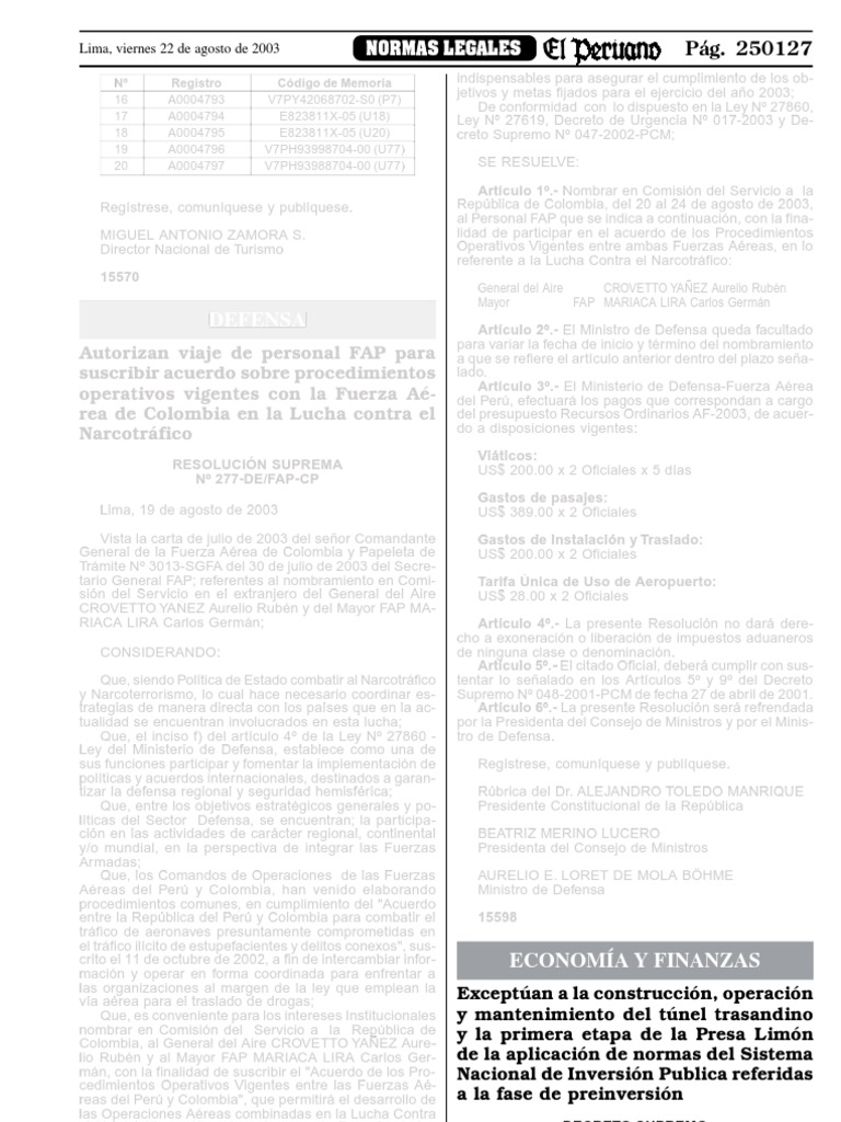 indispensables para asegurar el cumplimiento de los objetivos y metas fijados para el ejercicio del ao 2003; De conformidad con lo dispuesto en la Ley N 27860, Ley N 27619, Decreto de Urgencia N 017-2003 y Decreto Supremo N 047-2002-PCM; SE RESUELVE: Artculo 1.- Nombrar en Comisin del Servicio a la Repblica de Colombia, del 20 al 24 de agosto de 2003, al Personal FAP que se indica a continuacin, con la finalidad de participar en el acuerdo de los Procedimientos Operativos Vigentes entre ambas Fuerzas Areas, en lo referente a la Lucha Contra el Narcotrfico: General del Aire CROVETTO YAEZ Aurelio Rubn Mayor FAP MARIACA LIRA Carlos Germn