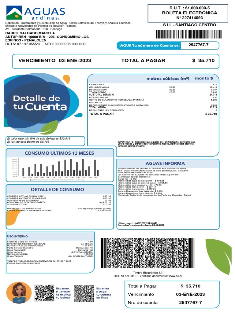 El IVA de esta Boleta es $5.703 IMPORTANTE: Recuerde que a partir del 01/12/2022 el consumo que