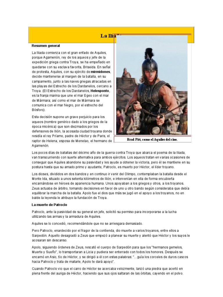 Resumen general La Iliada comienza con el gran enfado de Aquiles, porque Agamenn, rey de los aqueos y jefe de la expedicin griega contra Troya, se ha empeado en quedarse con su esclava favorita, Briseida. En seal de protesta, Aquiles, con su ejrcito de mirmidones, decide mantenerse al margen de la batalla, en su campamento, junto a las naves griegas atracadas en las playas del Estrecho de los Dardanelos, cercano a Troya. (El Estrecho de los Dardanelos, Helesponto, es la franja marina que une el mar Egeo con el mar de Mrmara; as como el mar de Mrmara se comunica con el mar Negro, por el estrecho del Bsforo). Esta decisin supone un grave perjuicio para los aqueos (nombre genrico dado a los griegos de la poca micnica) que son diezmados por los defensores de Ilin, la acosada ciudad troyana donde resida el rey Pramo, padre de Hctor y de Paris, el raptor de Helena, esposa de Menelao, el hermano de Agamenn.