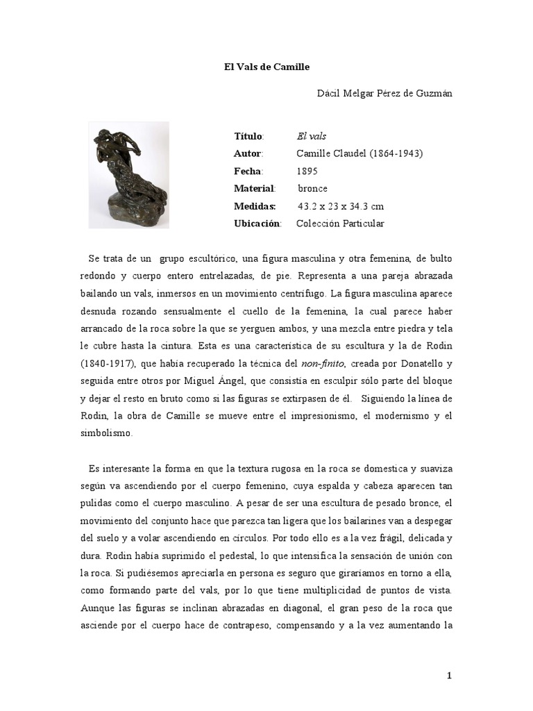 termina en 1895 El vals, una obra tan tierna y pasional como la propia escultora. Esta